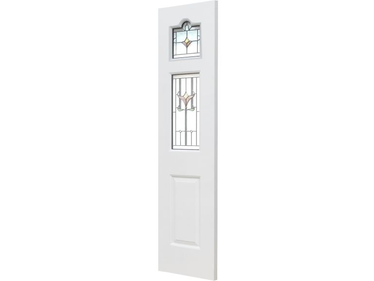 The Mortlake Sidelight is designed to perfectly accompany the Mortlake door, featuring raised and fielded panels and a glazed section with obscured, coloured, and leaded glass to mirror the door’s elegant design. Primed and ready for painting, it can be finished to match any décor, adding light and charm while maintaining privacy, and enhancing the Arts-and-Crafts style with Victorian character for a timeless, classic entrance.