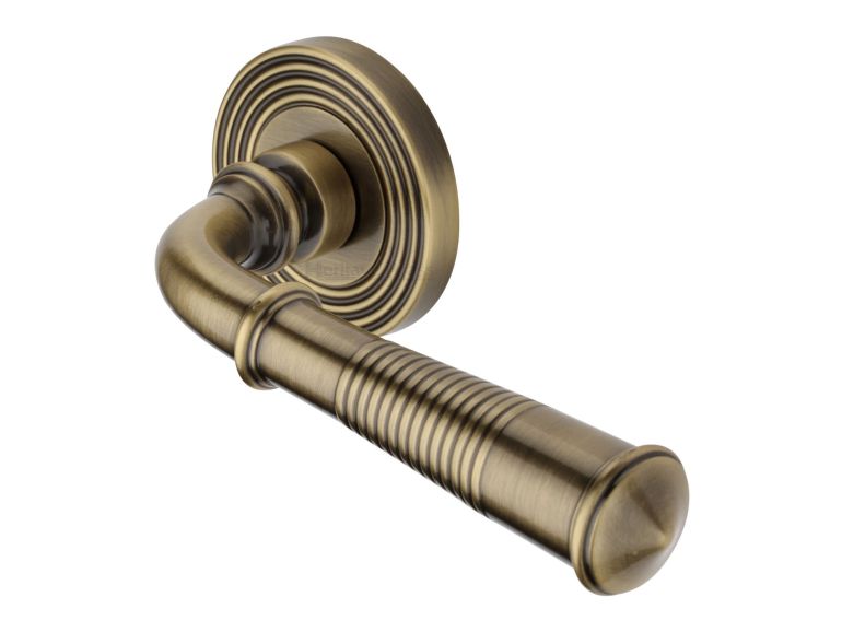 Heritage Brass Door Handle Lever Latch on Round Rose Bridgetown Reeded Design Antique Brass finishUK Registered Design Number 6226297