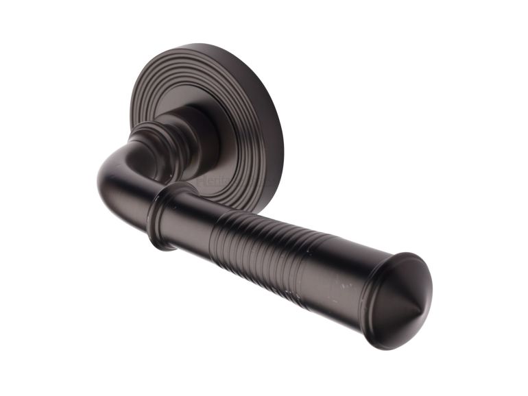 Heritage Brass Door Handle Lever Latch on Round Rose Bridgetown Reeded Design Matt Bronze finishUK Registered Design Number 6226297